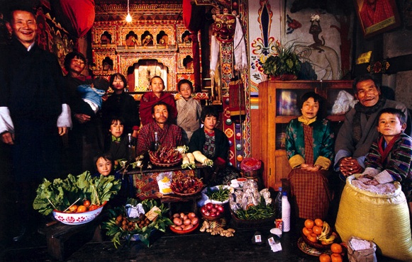 Seize familles vivant dans les cinq continents, derrière une table présentant tout ce qu'elles mangent pendant une semaine....